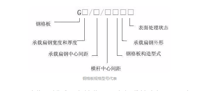 G253/30/50鋼格板最新標準:G代表鋼格板;253代表承載扁鋼寬度25mm,厚度3mm;承載扁鋼間距30mm,橫桿50mm;扁鋼構(gòu)造形式W代表壓焊(在標記中可省略),L代表壓鎖(也就是我們常說的插接鋼格板);承載扁鋼外型F代表平面型扁鋼(可省略),I代表I型鋼,S代表齒形扁鋼;表面處理狀態(tài)G代表熱鍍鋅,P代表涂漆,U代表表面不處理