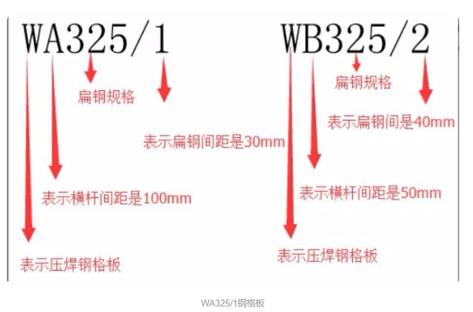 鋼格板最新的標準是YB/T4001-2007,如:G253/30/50.在此之前,我國的鋼格板標準一直沿用的是1998年制定的標準,也就是YB/T4001-1998。在老版本的國家標準中常用的鋼格板規(guī)格型號的標示方法就是諸如:WB253/1之類的。而在鋼格板YB/T4001.1-2007標準中,對鋼格板的標示方法做出了新的規(guī)定,新標準的標示方法淺顯易懂,我們對這兩種對應(yīng)的不同的標示法做一個說明。